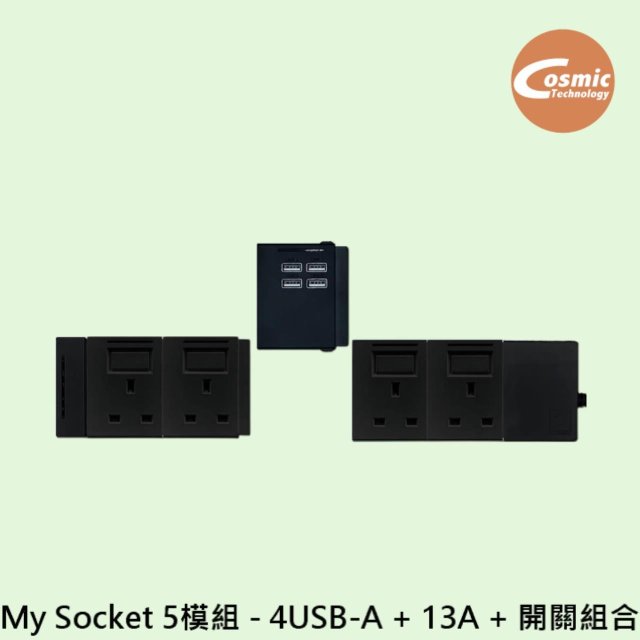 My Socket 5模組 - 4USB-A + 13A + 開關組合 (黑色)