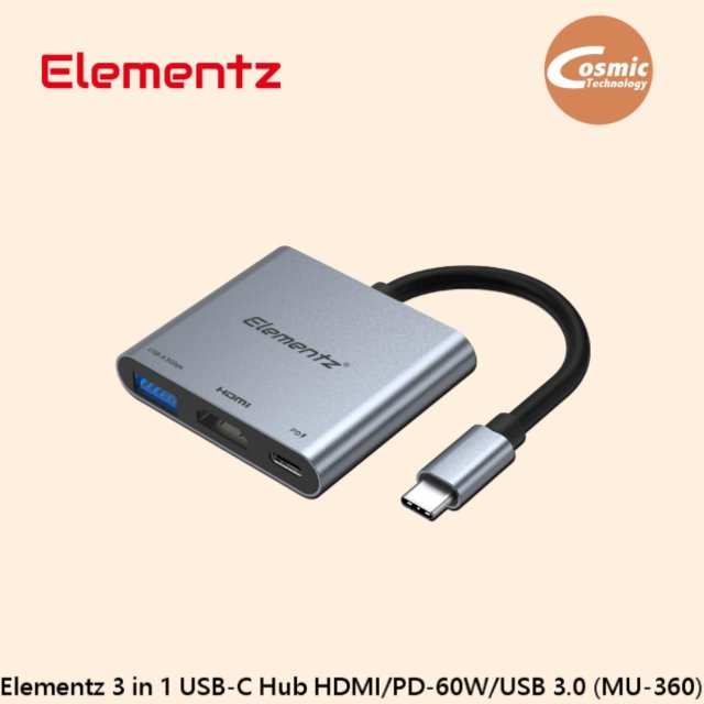 Elementz 3 in 1 USB-C Hub HDMI/PD-60W/USB 3.0 (MU-360)